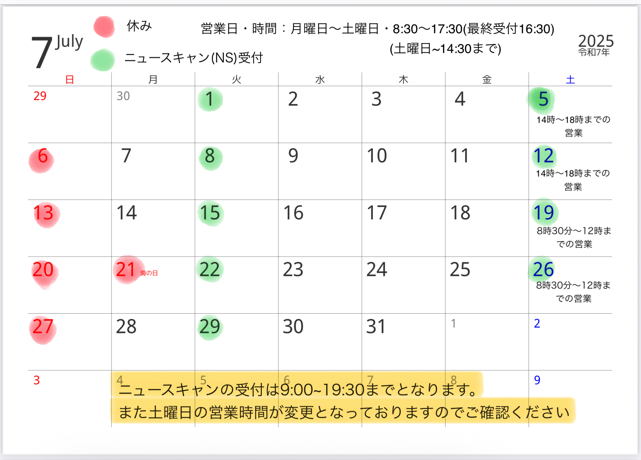 6月も後半となり夏の暑さを感じる日が増えてきましたね。 7月は学校の行事や地域のイベントなどで土曜日の営業時間が短くなっております。 ご迷惑をおかけしますがご理解のほどよろしくお願いいたします🙇 ご予約の際は営業カレンダーをご確認ください。
