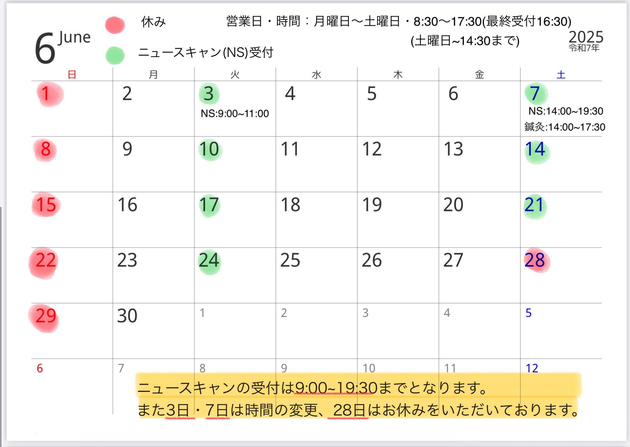 6月は学校行事などの関係で営業時間に変更のある日がございます。カレンダーをご確認ください。