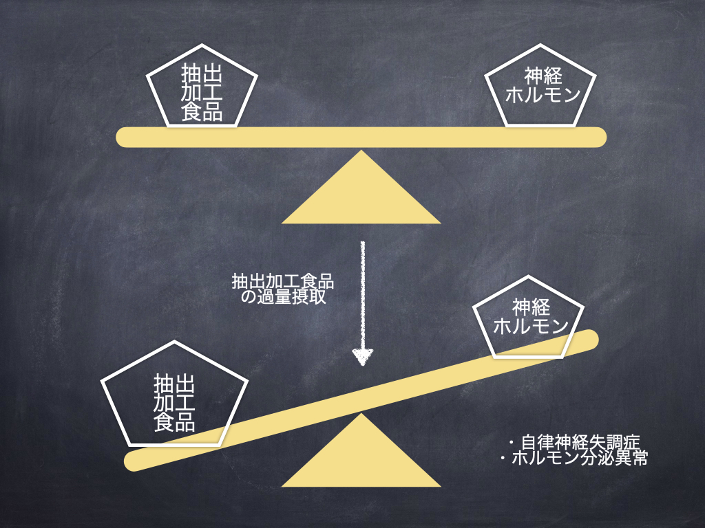 シーソーの一方の端には、体に負担をかける「抽出加工品」の重さが乗り、もう一方の端には、それを元に戻そうとする「自律神経やホルモン」の力が乗っています。