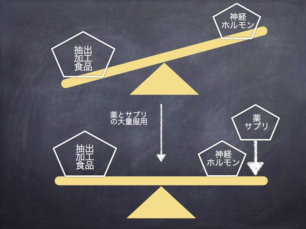 しかし、食生活が変わらない限り、抽出加工品の重さは増え続け、やがて一つの薬だけではバランスが保てなくなります。